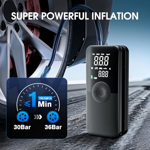 【 3X Rapid Inflation 】: Equipped with a motor with 3 times the power, it can provide an airflow of 36L/Min. Inflate small car tires within 1 minute [30-36PSI]. Portable tire inflator suitable for cars, motorcycles, bicycles, and balls. Attention: After every 15 minutes of use, please allow the compressor to cool for at least 10 minutes.